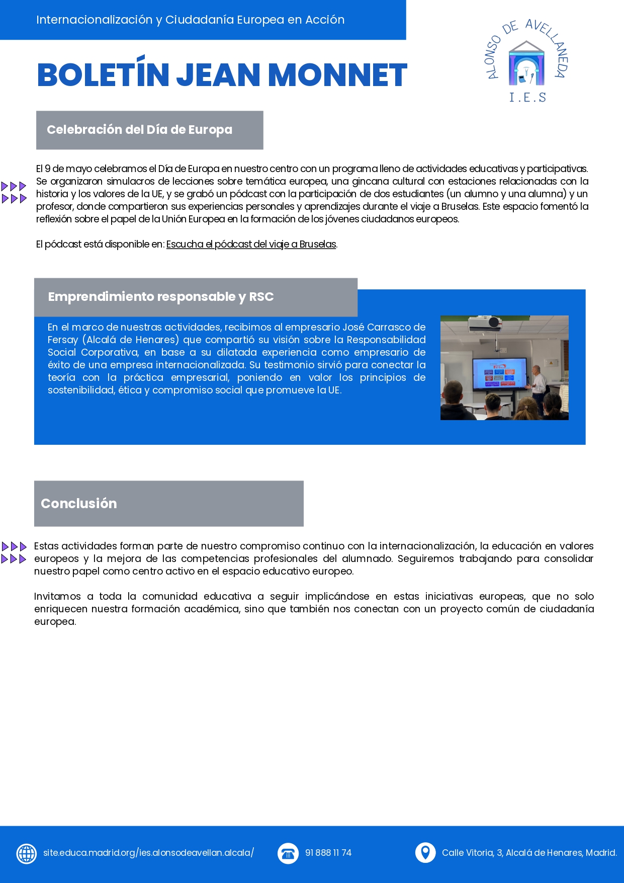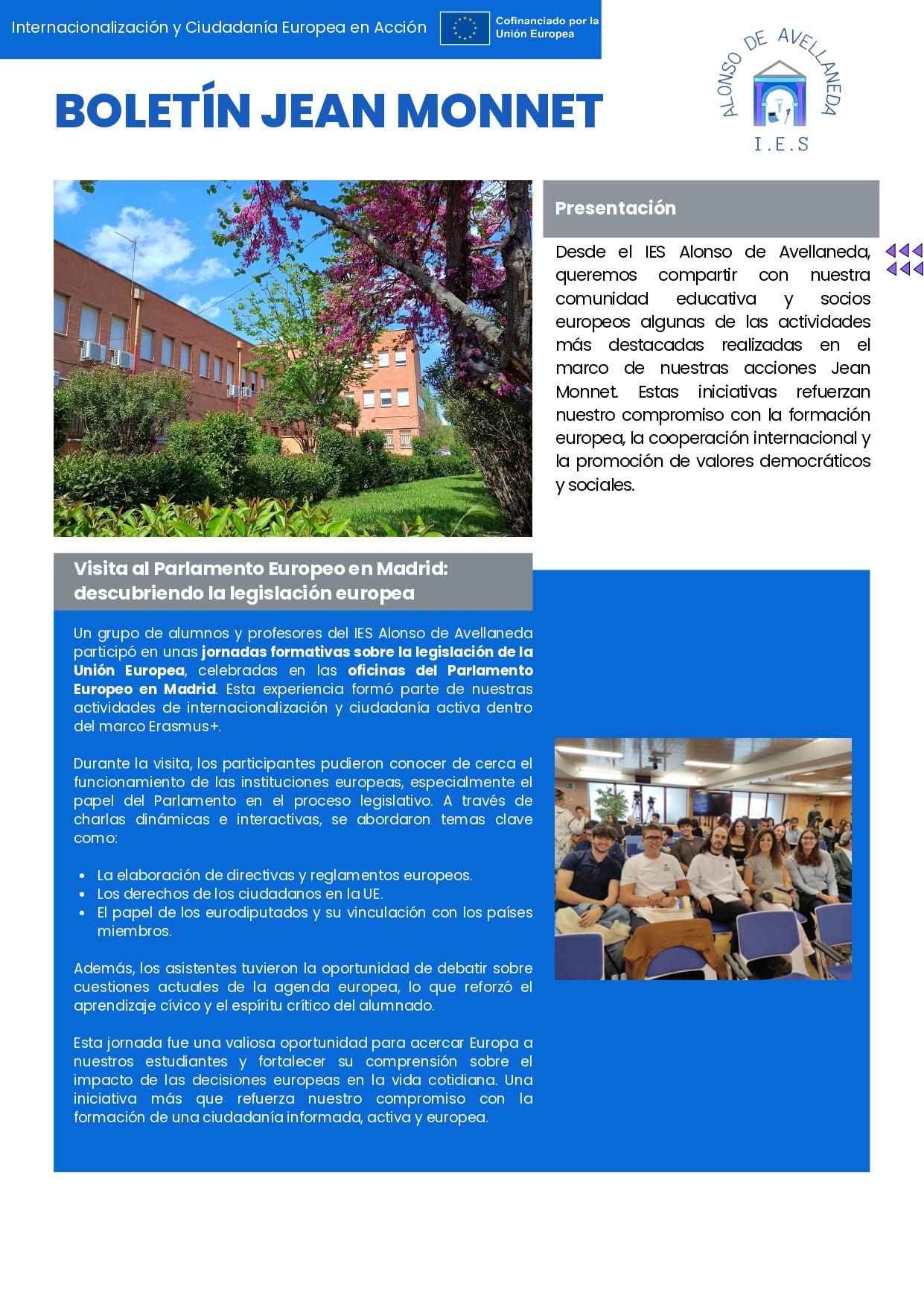 El 9 de mayo de 2025 se celebró el Día de Europa en el IES Alonso Avellaneda. Se organizaron diversas actividades en el centro, incluyendo un simulacro de elecciones europeas. Además, por la mañana, se llevó a cabo una conexión virtual con un centro escolar de Rumanía, como parte del proyecto EPASSIONATE. La jornada tuvo como objetivo conmemorar y destacar la importancia de la Unión Europea. Este evento permitió la participación activa de los estudiantes y fomentó la conciencia sobre temas europeos