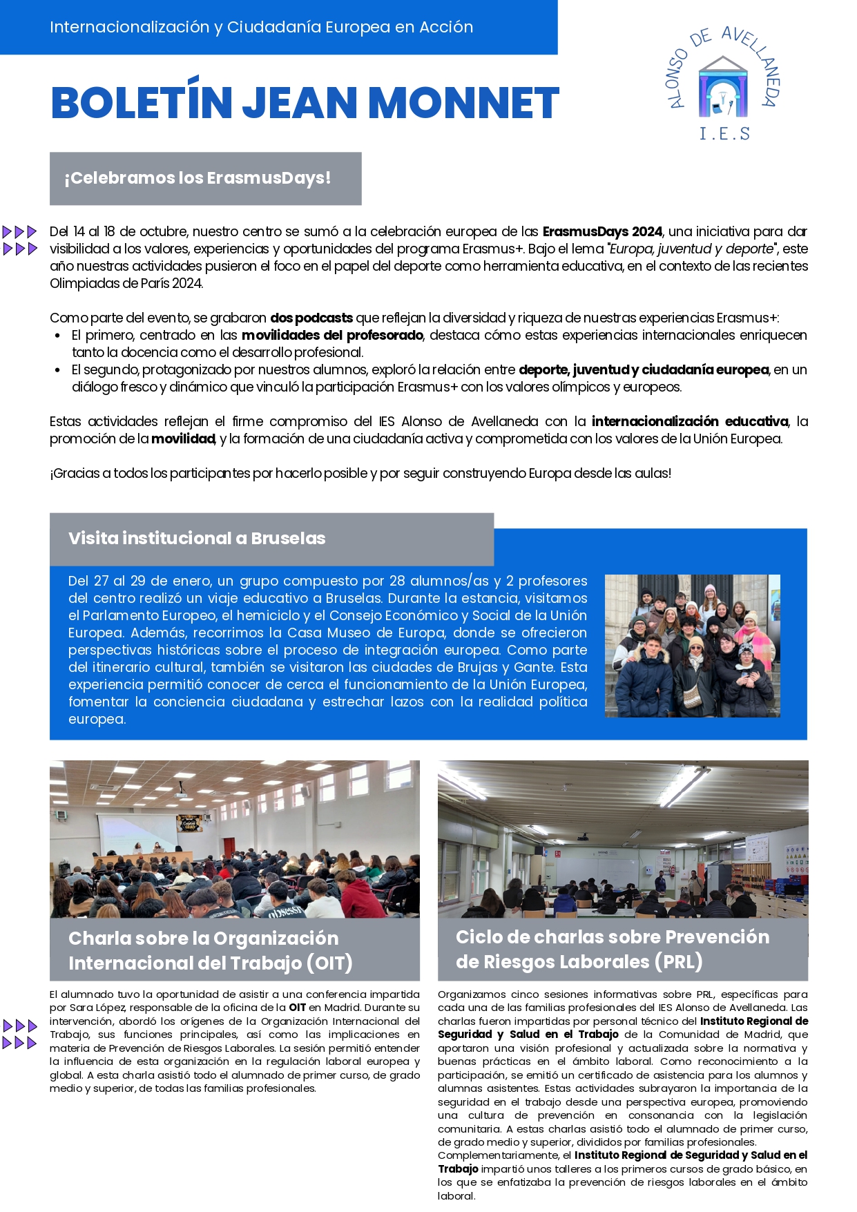 En los días 22, 27 y 31 de enero de 2025, el Instituto Regional de Seguridad y Salud en el Trabajo de la Comunidad de Madrid impartió charlas sobre Prevención de Riesgos Laborales en el IES Alonso de Avellaneda. Estas charlas se dirigieron a los alumnos de primer curso de Grado Medio y Superior. Se abordaron temas sobre salud y prevención en el ámbito laboral mediante dinámicas interactivas sobre peligros en el entorno laboral y su prevención.